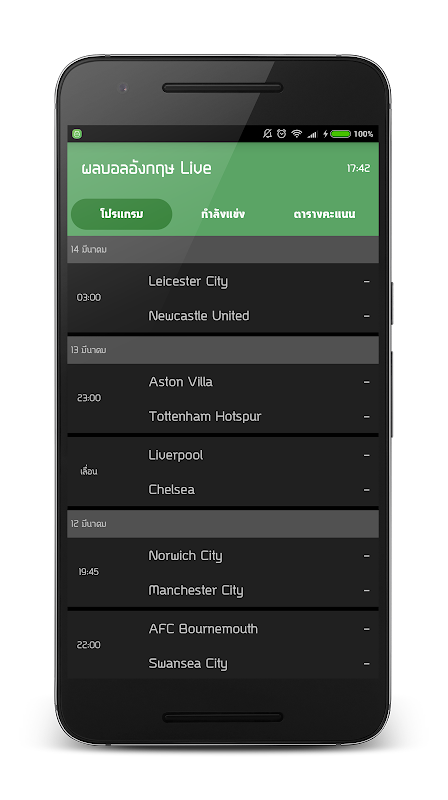 - ดึงลง, ไสลด์ลง, (Pull To Refresh) เพื่ออัพเดทผลการแข่งขันได้ทันที