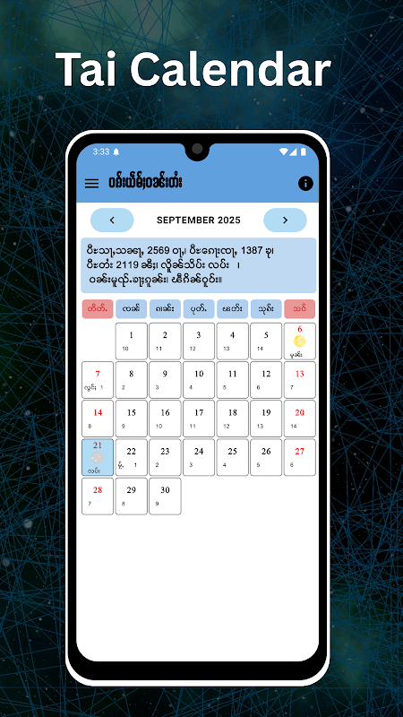 Bienvenido a la aplicación Tai Calendar, la herramienta perfecta para una organización sin esfuerzo. Diseñada centrándose en la simplicidad y la funcionalidad, la aplicación Tai Calendar te ayuda a ver el calendario en idioma Shan o Tai.