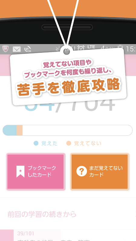 「覚えた」「覚えてない」のカード数が表示されるだけでなく、各項目名の背景色の長さが「覚えた」カードの数に応じて変わります。苦手分野の学習進捗率も一目で分かります。