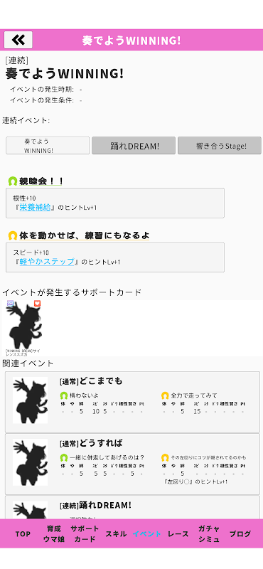 Incluye caballos de entrenamiento, tarjetas de apoyo, eventos relacionados, habilidades, pistas de carreras y datos de gacha que aparecen en el juego. (Los últimos datos se actualizarán de vez en cuando)
