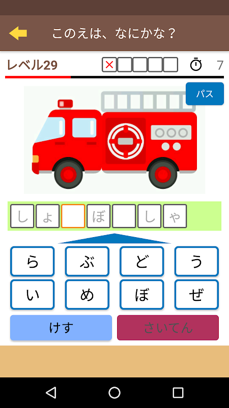 絵をみて、それが何か?を「ひらがな」「カタカナ」で入力。虫食い問題で入力文字数や制限時間によりレベル1~100まであり、各レベル全問正解で次のレベルに進めます。