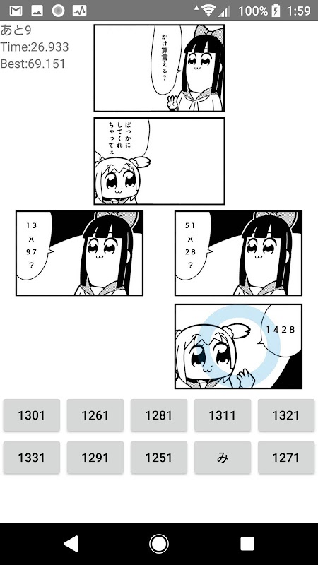 ポプテピピックのポプ子が2桁のかけ算を答えるkusoアプリ2コマ目の「ばっかにしてくれちゃってぇ」をタップでスタート最大は99×99みみんがみ!