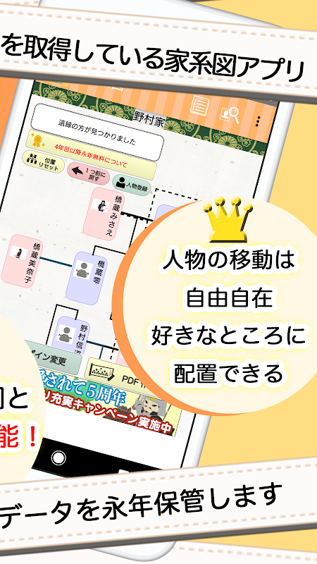 Aplicación de árbol genealógico número uno de gran éxito en Japón, con más de 1,5 millones de usuarios registrados. Dirigida por la única empresa en la industria de árboles genealógicos que ha adquirido la marca de privacidad. Número uno en general en la App Store. Aplicación oficial para la red derivada de apellidos.
