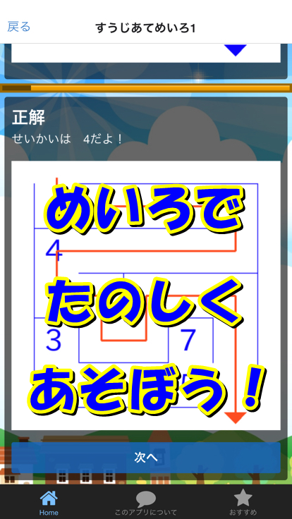 このアプリは、クイズとめいろが合体した、お子様向けのアプリとなっております。迷路をクリアしながら、ゴールにたどり着ける道すじは、何番の数字かを当てるだけです。