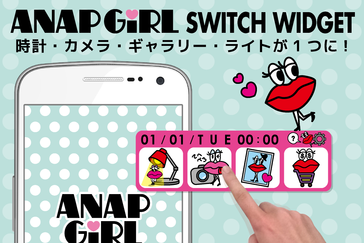 人気レディースブランド『アナップガール(ANAP GiRL)』の無料時計(クロック)ウィジェットアプリ登場♪ウィジェットをホーム画面に設置して、いつでもどこでもすぐに時間を確認できちゃうよ☆時計の他にも生活に役立つ機能が満載しているよ!カワイイキャラクター『ジョリーちゃん』のウィジェットを無料でゲットしちゃおう☆