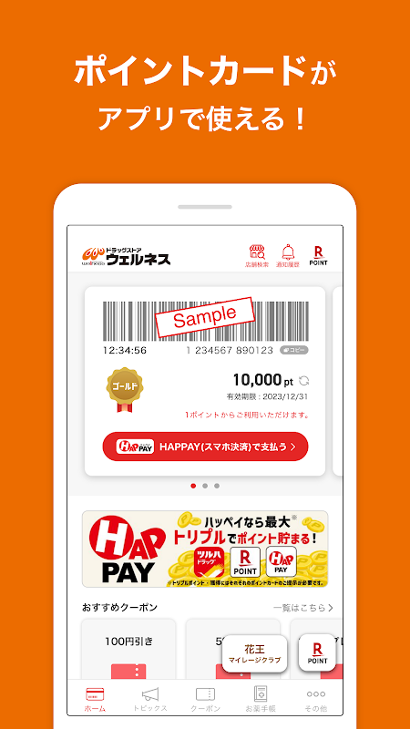 Puede mostrar tarjetas de puntos, realizar pagos con teléfonos inteligentes, obtener cupones, consultar excelentes ofertas, como información de eventos e información de campañas, búsqueda de tiendas y enlaces a aplicaciones de cuadernos de medicamentos.