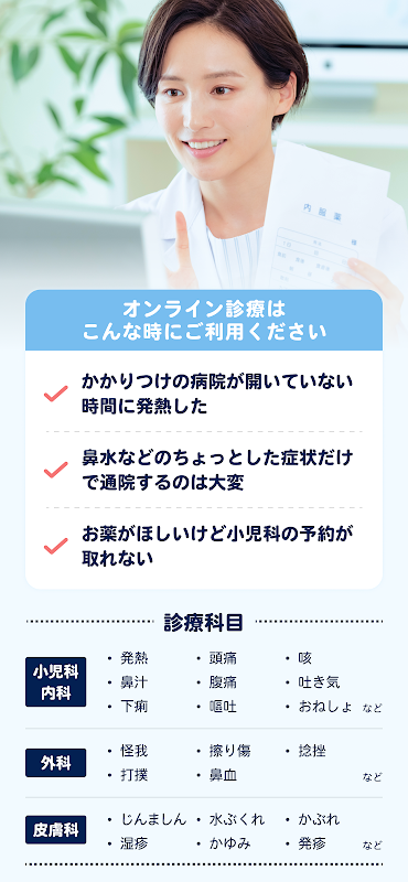 Obtenga consultas y recetas en línea de su médico en casa, incluso de noche y días festivos. También puedes pedir consejos de salud a las enfermeras a través del chat. Compatible con el seguro médico y el subsidio de gastos médicos de los niños, los honorarios distintos de los de consulta son gratuitos. Brindar atención médica que ayude a criar a los niños.