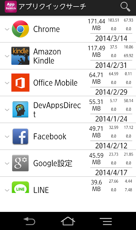 アプリの詳細画面にジャンプしなくても、アプリのデータサイズが一覧で分かります。