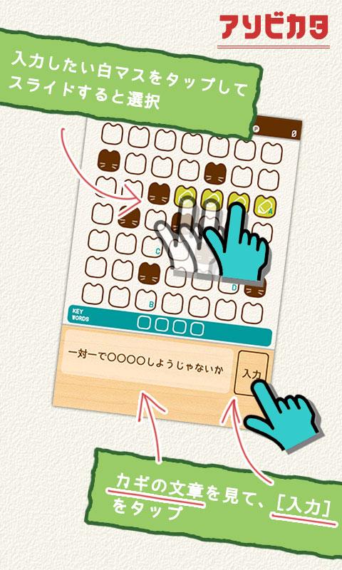 カギの文章をヒントにして、白マスを全て正しい単語で埋めればクリアです。