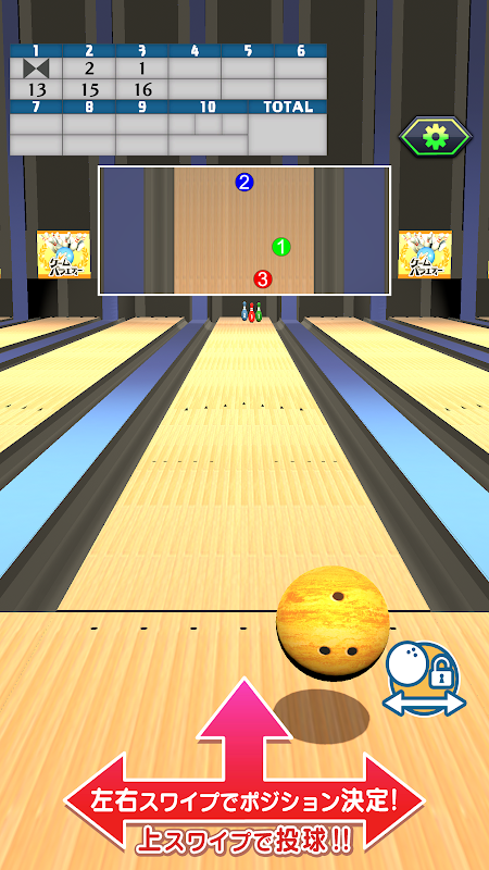 前後左右の軌道変更によって、複雑な配置のピンを順番通り倒しましょう。