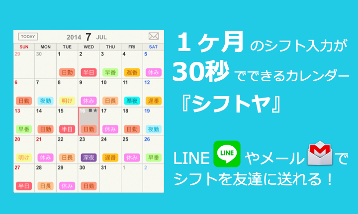 Aplicación de gestión de horarios y calendario de trabajo para farmacéuticos que trabajan en turnos ★ El registro de turnos de un mes se completa en solo 30 segundos ♪ Los turnos registrados se pueden compartir fácilmente con amigos por línea o correo electrónico.