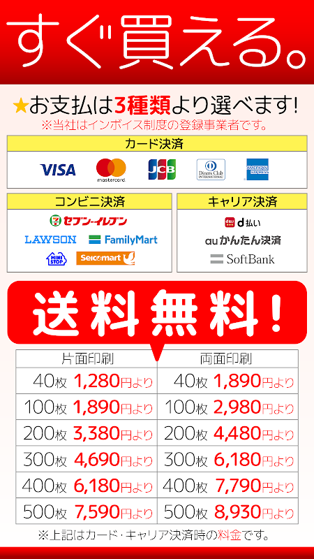 Una sencilla aplicación de creación de tarjetas que te permite realizar pedidos inmediatamente después del diseño. Incluso si no tienes una computadora o una impresora, puedes imprimir las tarjetas que diseñaste y recibirlas. Puede elegir entre tres métodos de pago: pago con tarjeta, pago con transportista y pago en tienda de conveniencia.