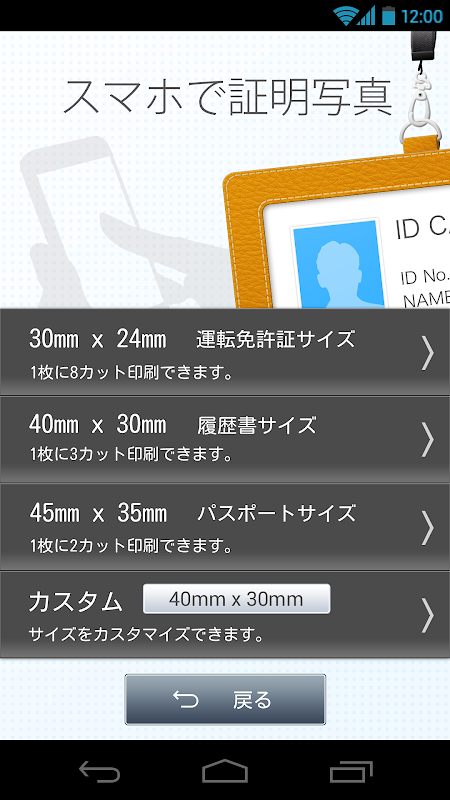 「スマホで証明写真」は、用途に合わせた様々なサイズの証明写真を、簡単な手順で、手軽に作成・プリントすることができるアプリケーションです。