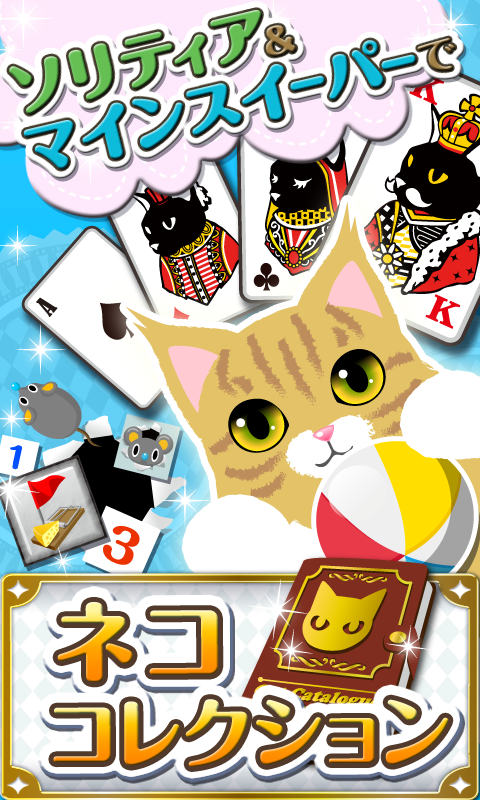 「ソリティにゃスイーパー!」は、みんな一度は遊んだことがあるソリティア(一人用トランプゲーム)とマインスイーパー(一人用パズルゲーム)で遊びながら、かわいい猫をコレクションしていく基本無料のゲームです。