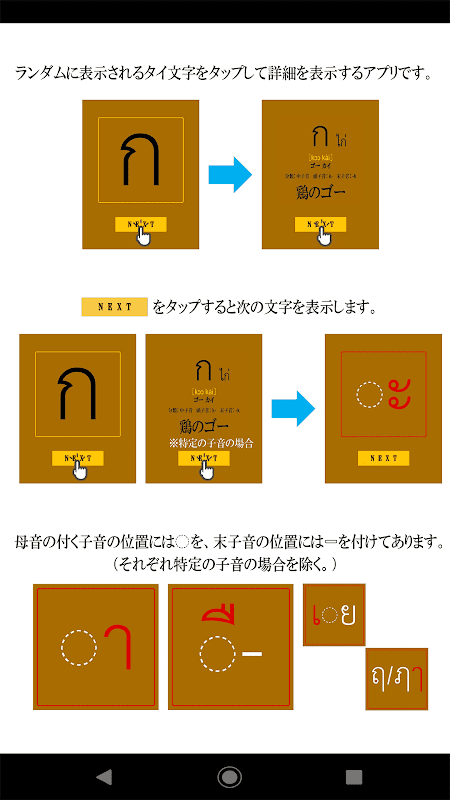 Dado que los caracteres se muestran aleatoriamente, puede avanzar y aprender letras tailandesas que son difíciles de recordar, en orden. También puede seleccionar caracteres para ver detalles de la lista de caracteres. Además, puedes aprender por tipo de carácter solamente, como solo consonantes y vocales.