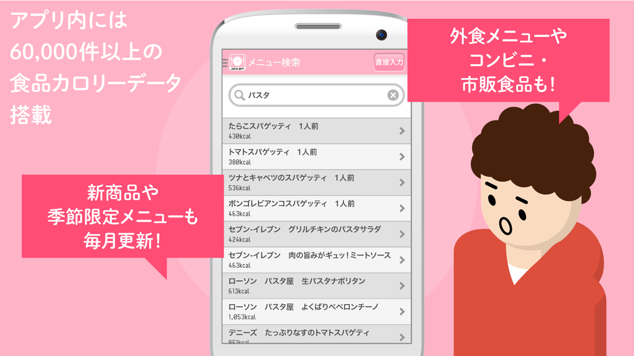 アプリ内には「ご飯」「野菜炒め」「卵焼き」などの一般料理から「スターバックス」「マクドナルド」などの外食メニュー、「セブン-イレブン」「ローソン」などのコンビニ商品まで、合計で60,000件以上の食品データが登録されています。さらに毎月の新商品や季節のメニューなども毎月更新いたします。