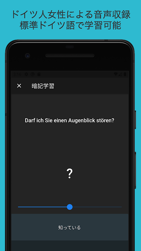 ドイツ語のリスニング力を鍛えるためのアプリです。ドイツ人女性によるネイティブ音声、2000以上の例文を通じてドイツ語を聞き取るトレーニングを行います。