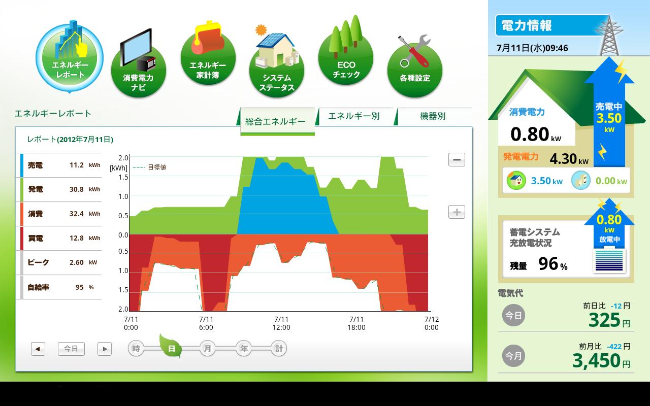 お客様宅内の電力の使用状況のほか、ソーラー発電システム、蓄電システムの状況の表示が可能です。