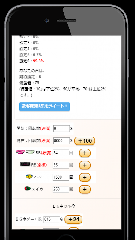 ・ゲーム数と大当たり回数を入力するだけで瞬時に設定を計算することができます。