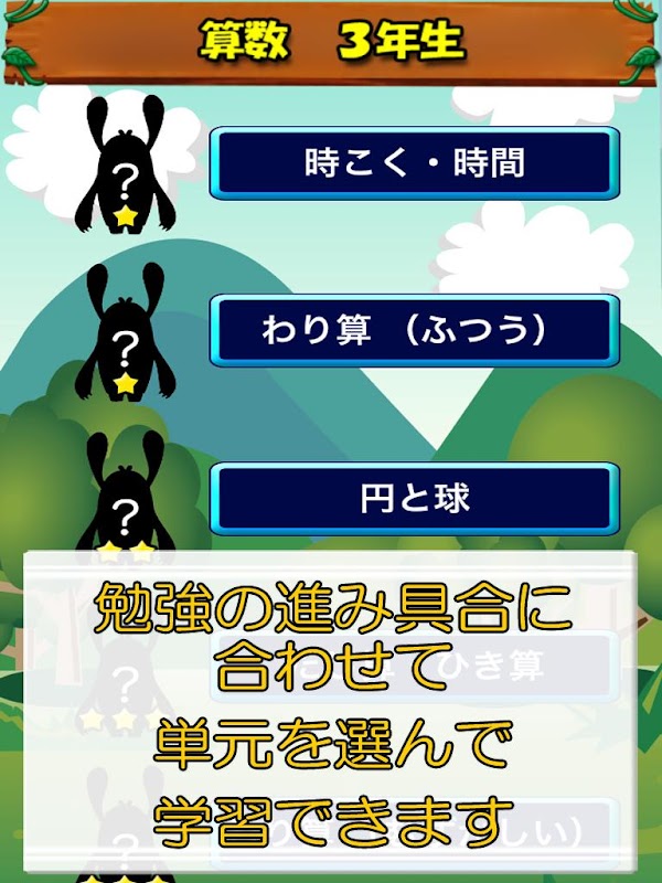 小学校3年生の算数アプリの決定版!学習の進み具合に合わせて単元を選択して、効率的に復習できます。4択のクイズ形式という使いやすさ、勉強のご褒美にモンスターを集めていく楽しさで、子供が継続的に勉強します。