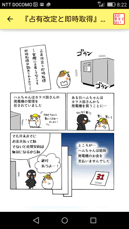 このアプリはよくある「マンガでわかる○○」とあるのに、実際にはマンガはオマケ程度でほとんど文章解説ばかりという本とは違い、民法判例の事実関係から、結論まで全てマンガにして分かりやすく解説します。マンガの他に簡単な文章解説も用意しているので、更に理解が深まります。