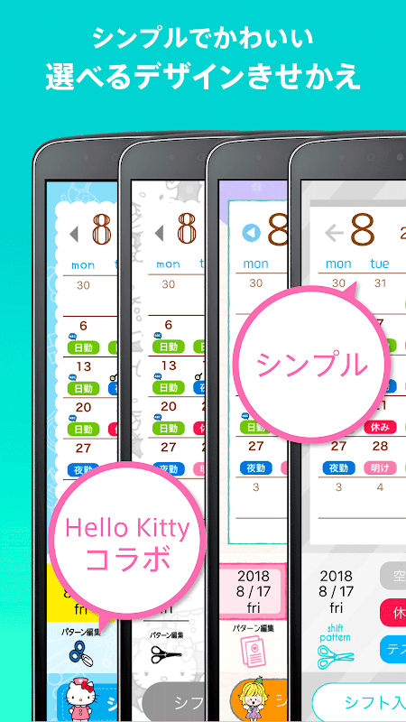 ハローキティのかわいいデザインから、シンプルなデザインまで、好みのデザインにきせかえできます。