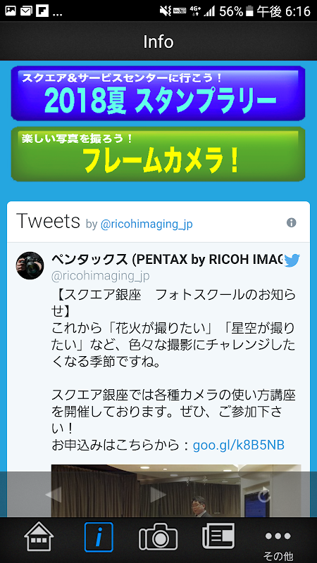En esta aplicación, Ricoh Imaging plaza, varios eventos en el centro de servicio de reparación, exposición fotográfica, la escuela de fotos, además de mí, como seminarios de información, reunión sello en la función de AR utilizando el servicio de papel con enlace, - una variedad de contenido digital, como cámara de fotograma se puede disfrutar de la experiencia en cooperación con la plaza de imagen de Ricoh.