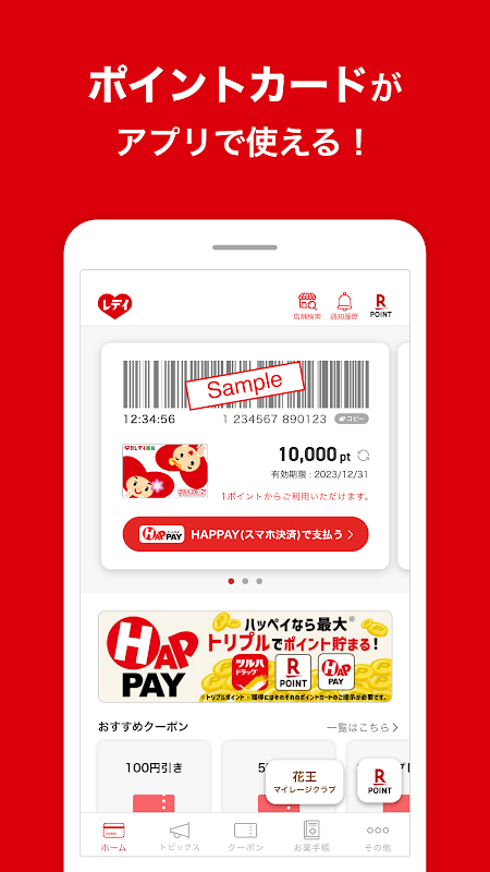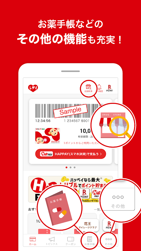 Puede mostrar tarjetas de puntos, realizar pagos con teléfonos inteligentes, obtener cupones, consultar excelentes ofertas, como información de eventos e información de campañas, búsqueda de tiendas y enlaces a aplicaciones de cuadernos de medicamentos.