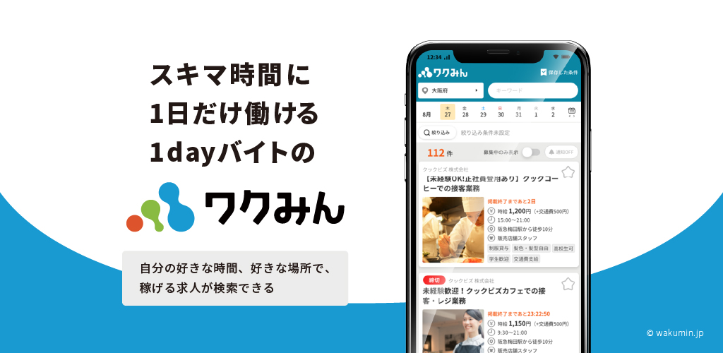 「スキマ時間副業」が増える時代。『ワクみん』は、時間を有効活用した働き方を応援する、ワンデイバイト求人検索アプリです。アプリをインストールし即日勤務も可能!