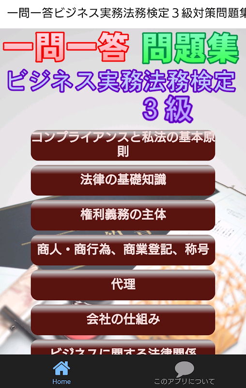 ビジネス実務法務検定3級の試験対策一問一答形式の問題集です。頻繁に出題された過去問題を中心に330問収録し、解説も充実したアプリです。