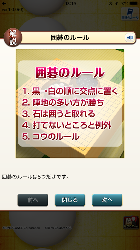 Los maestros que tienen la reputación de ofrecer explicaciones fáciles de entender han escrito explicaciones de las reglas de Go para esta aplicación, por lo que incluso los principiantes pueden comenzar a jugar Go con confianza.