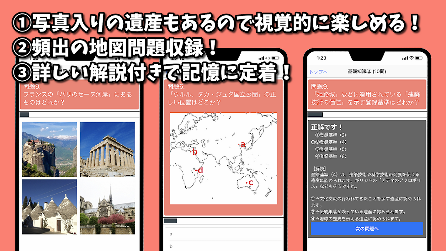 テキストを理解できれば満点取れるように作成してあります。テキストを参考にしつつ、この問題集を何度も解けば記憶に定着していきますので、世界遺産検定4級対策の一つとして是非本アプリをご利用ください。