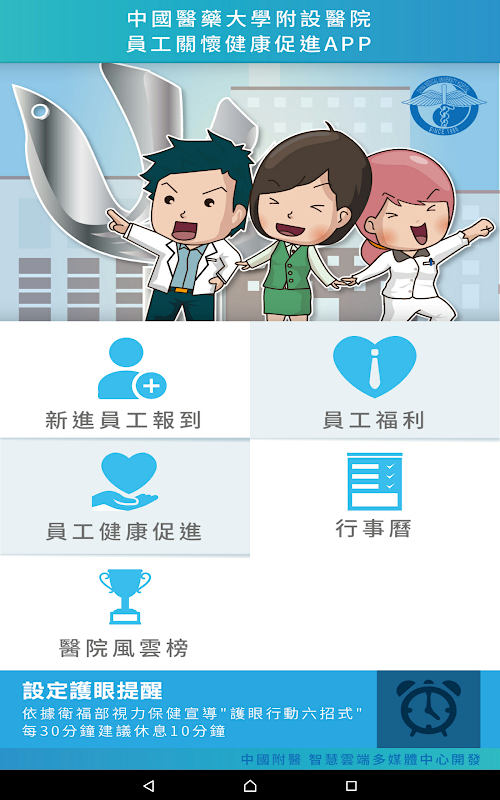 臺中中國醫藥大學附設醫院推動院內員工APP系統,協助新進員工運用網路科技做好報到程序,同時透過APP與醫院連線,內容包含員工健康促進、院內員工交流及員工福利事項等,使員工了解享有之福利並提供貼心服務,本APP可連結行事曆及交通車時刻,隨時查詢院內資訊。