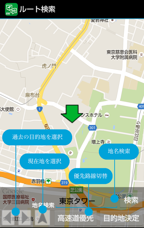 Puede establecer un destino y buscar una ruta. Puede ver la información sobre las medidas enérgicas en la ruta de un vistazo. Vaya a la pantalla de configuración de destino desde el menú "Búsqueda de ruta" en la pantalla superior. (Nueva función Ver7.0)