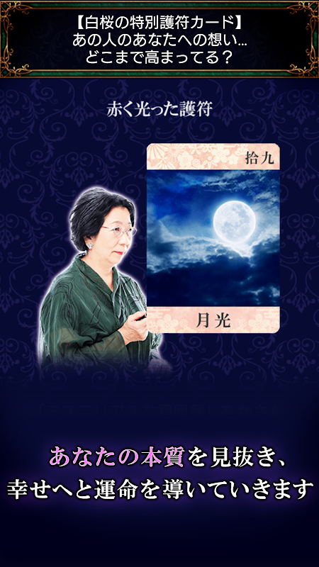 交渉に交渉を重ね、やっと実現しました。何を占っても当てると言われる彼女の百戦錬磨の占いをあなたのお手元でお楽しみいただけます。