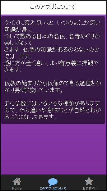 クイズアプリです。クイズに答えていくと、いつのまにか深い知識が身について数ある日本の名仏、名寺めぐりが楽しくなってきます。
