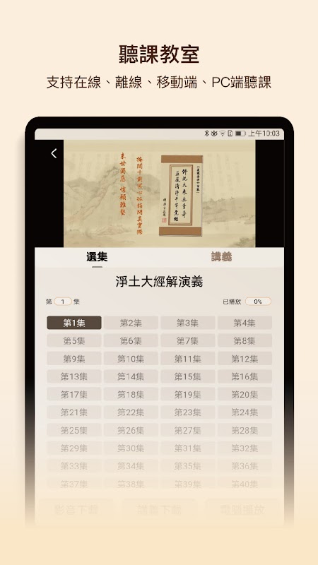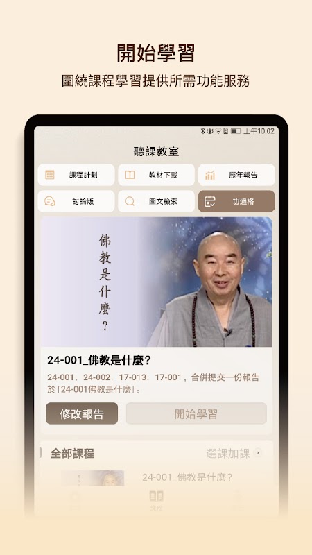 La aplicación "Buddha Education Network Academy" sigue las enseñanzas de la "enseñanza de nueve años" del viejo monje Jingkong. Los cursos se basan principalmente en conferencias en línea y los estudiantes discuten entre sí como complemento. El método de enseñanza es con un estudio profundo, de largo plazo y con énfasis en la escucha de las escrituras, después de cada curso se debe entregar un informe de experiencia de aprendizaje como logro académico. Después de completar el curso cada año, puede actualizar e ingresar a la siguiente etapa de estudio. Todos son bienvenidos a estudiar en línea juntos, animarse unos a otros y no estarán solos en el aprendizaje.