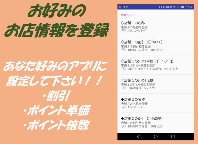Con esta aplicación, puede averiguar rápidamente qué tienda es la mejor oferta. Las ganancias y pérdidas se calculan a partir del monto del pago (monto considerando el descuento) y el punto de devolución, y el precio se compara para cada tienda.