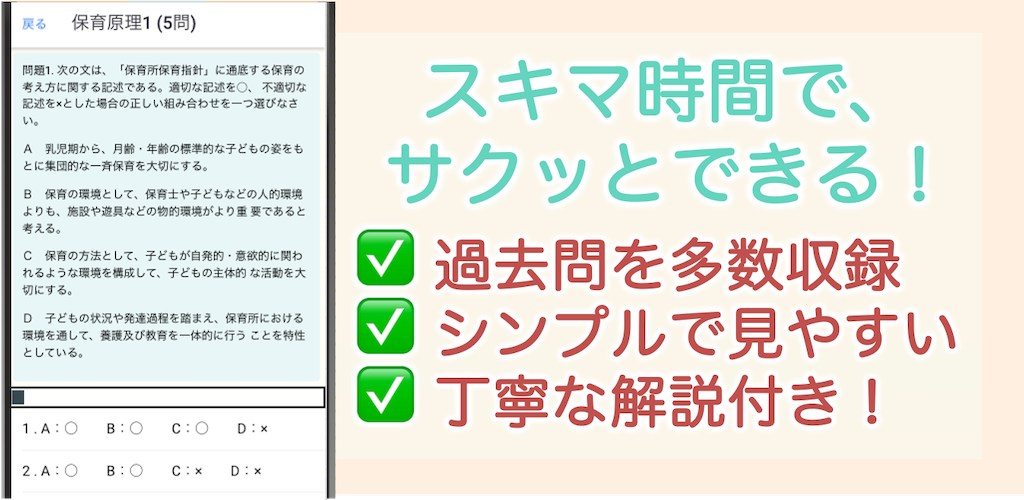 ¡El maestro de guardería pasó la aplicación de preguntas pasadas rápidamente! Es una aplicación de medidas de maestra de guardería que puedes aprender resolviendo problemas en tu tiempo libre. Preguntas cuidadosamente seleccionadas que a menudo aparecen en el examen. Cubre temas de examen. Con explicación detallada.
