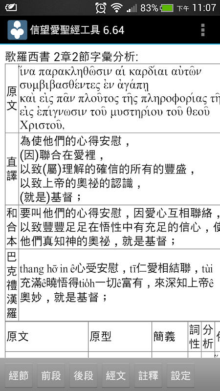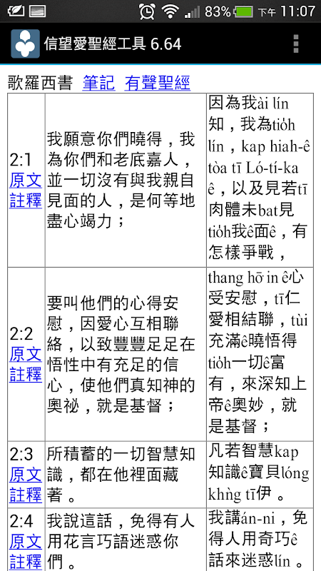 Además de la función de la Biblia china, también tiene herramientas de texto original como comparación de versiones, numeración de texto original, diccionario de texto original, análisis de vocabulario, etc., así como la función de anotación de algunas escrituras, que es adecuada para la Biblia. estudio. Entre ellos, la anotación, el análisis de vocabulario y la comparación de versiones, puede elegir capturar la información de la estación Xinwangai a través de Internet o descargarla para usarla sin conexión.