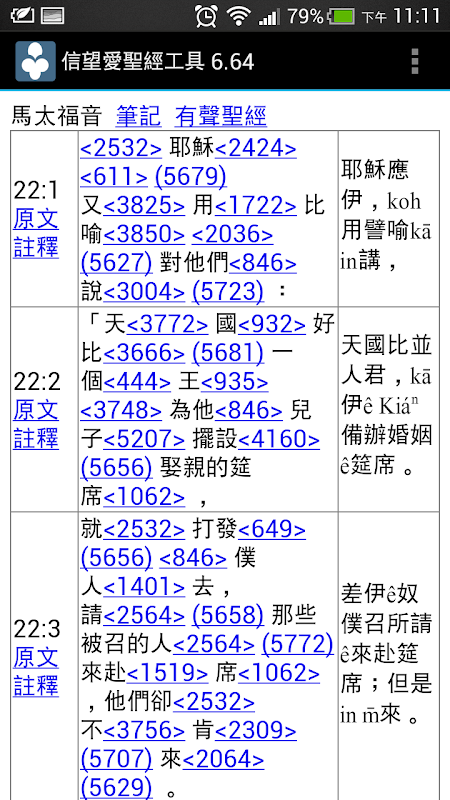 提供中文圣经版本对照、原文编号、原文字典、字汇分析、有声圣经、注释等研经工具,并可离线使用,内容常常更新