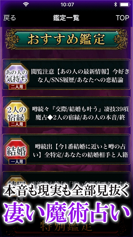 女性層のみならず、有名男性俳優や、芸能人。政財界からも圧倒的な支持を得る彼女の占いが遂にアプリで解禁。完全予約制で現在予約が取れない。TV出演後特に人気になり予約が取れなくなった