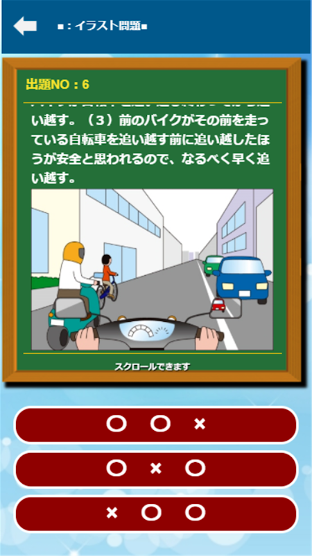 原付免許の試験問題を出題する免許取得の為の勉強アプリです。 一発合格の為、主にひっかけ問題を中心に出題します。標識イラスト一覧表など暗記に便利な機能付。