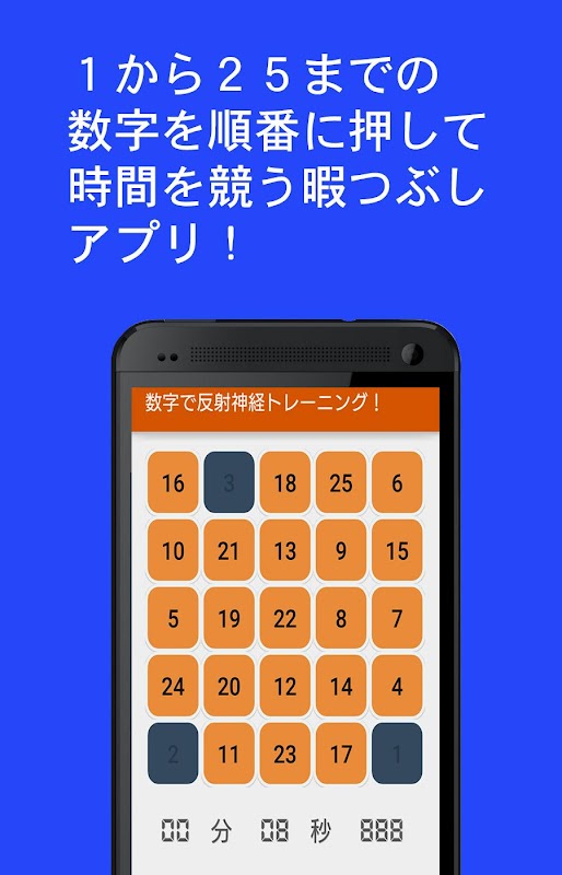 1から25のボタン数字を順番に押して、時間を競う暇つぶしゲームです。暇つぶしをしながら、反射神経・集中力を鍛えられることができます。