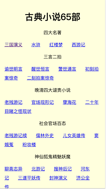 本应用收集整理了约65部中国古典小说,包括四大名著、三言两拍、晚清四大谴责小说、神鬼、爱情、艳情、历史、悬疑、武侠等分类。