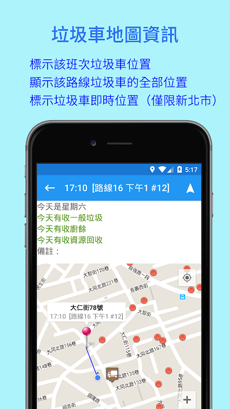 ★ 新北市垃圾車即時資訊:在地圖上標示出該班次新北市垃圾車的即時定位資訊