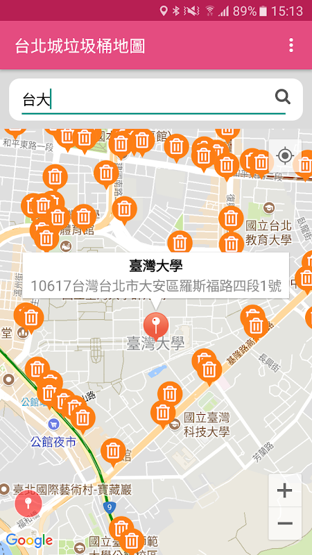 2. 可輸入台北市的路名/地址/景點名稱 (例如:台北101、台大醫院、和平東路二段339號...等) 來查看周邊的垃圾桶。