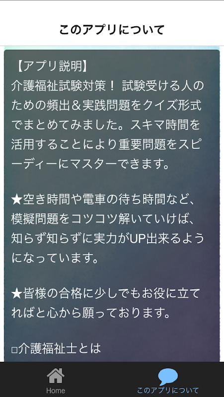 【アプリ説明】介護福祉試験対策! 試験受ける人のための頻出&実践問題をクイズ形式でまとめてみました。スキマ時間を活用することにより重要問題をマスターできます。