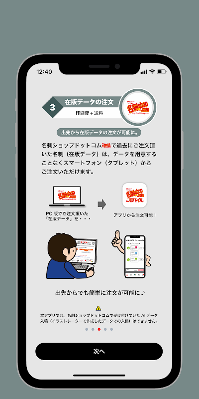「名刺ショップドットコム」と同じアカウントが使用可能で、予め用意されたテンプレート(100種類以上)に文字や写真、スタンプを使って簡単に名刺の作成・注文ができ、過去に「名刺ショップドットコム」でご利用いただいた在版データをアプリから注文が可能です。ネット印刷で敷居の高かったIllustratorデータ(aiデータ)入稿に頼らない、様々な方法で名刺を作成・注文できます。