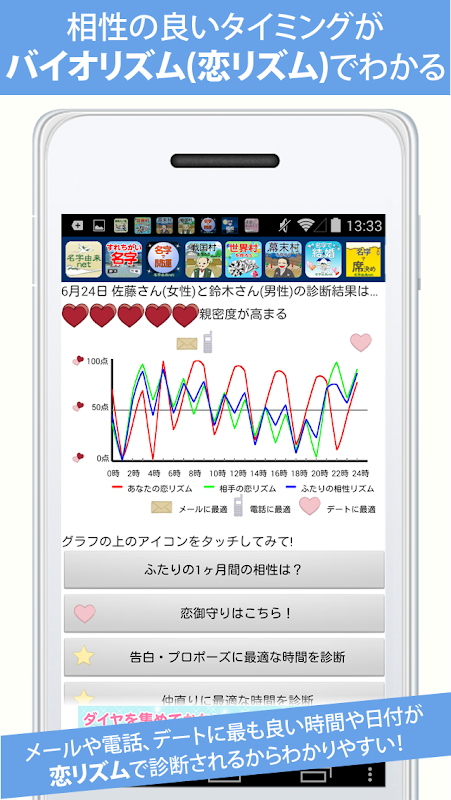 - La mejor hora y fecha para "correo electrónico", "teléfono" y "cita" se diagnostican fácilmente mediante biorritmo (ritmo de amor). Además, al utilizar la función "Alerta de buen momento", que hará sonar una alarma en ese momento, podrás saber cuál es el mejor momento para amar a tu pareja sin perder nada.